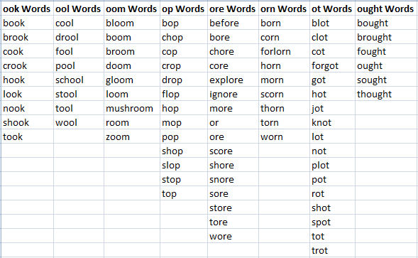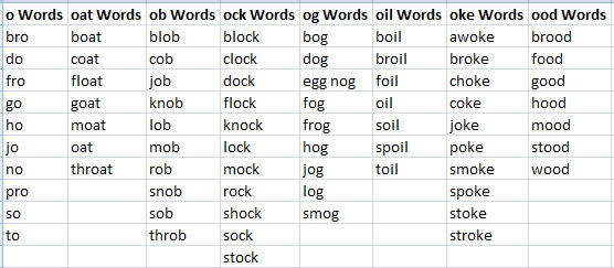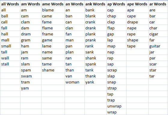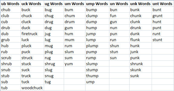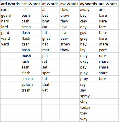 The word selection in Word Families was strictly my own. A few words were omitted from the original list, due to the sensitivity of the words. These words include: fag (which is slang for cigarette), gay (meaning happy), rape, cigar, rum. Beer was changed to "root beer" and ale was changed to "ginger ale," but in some circumstances was shortened to beer and ale.
